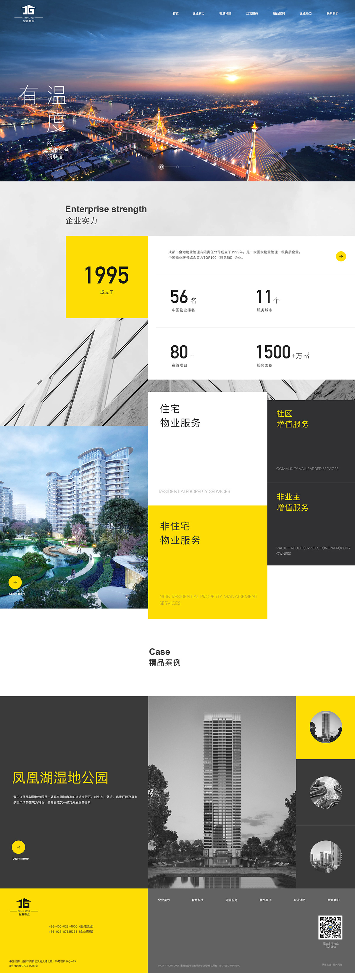 歷經25年的穩健發展,金港物業致力做“有溫度的城市綜合服務商”,其業態涵蓋住宅、寫字樓、商業物業、企業總部及機關事業單位、政府及其它公共設施、公園與景區、醫院與學校、產業園區、高速公路服務站等多種業態。