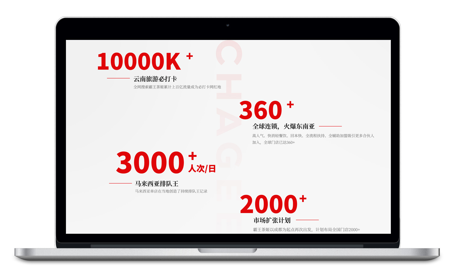 人們對于數字的敏感度遠高于其他文字和圖片,根據霸王別姬品牌的發展歷程,在這一塊的處理方式上,我們整理了品牌的一些關鍵數據,采用階梯式的左右布局輔以簡要文字說明,這些都是霸王茶姬品牌發展至今成果沉淀。